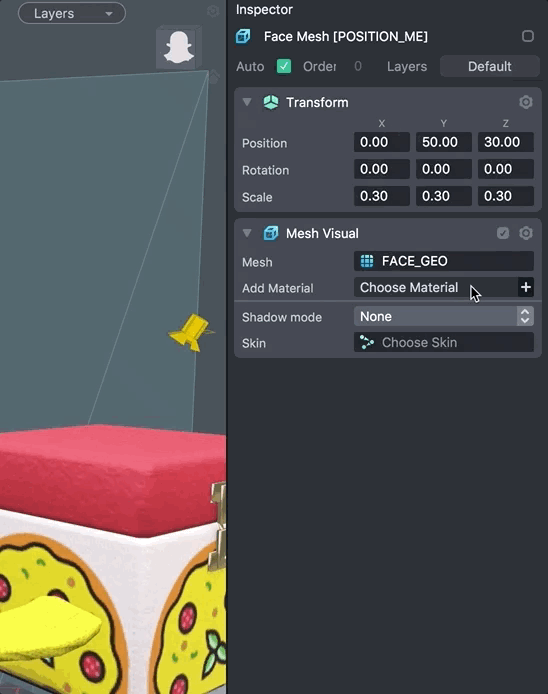 When using a custom mesh with the Face Image Picker, you need to assign the face_image_picker material to the mesh. Select your custom 3D mesh in the Objects panel. Select Choose Material in the Inspector panel. In the material selection window, find the face_image_picker material in the Material folder.