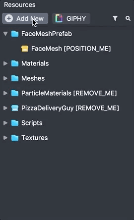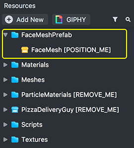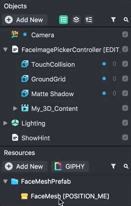 To use the Face Mesh prefab in Lens Studio, drag the prefab from the FaceMeshPrefab folder in the Resources panel to be a child of the FaceImagePickerController [EDIT_ME] object in the Objects panel.