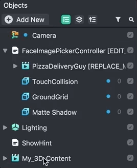 After importing your content, it will appear in the Objects panel. Drag and drop your content so that it is a child of the FaceImagePickerController [EDIT_ME] object. Once your custom content is added, you can delete the template’s placeholder content labeled with [REPLACE_ME].