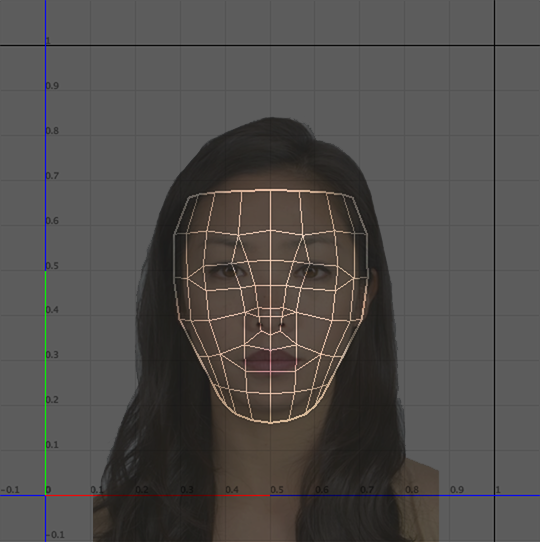 You can use the provided Face Mesh in Lens Studio which is already UV mapped to the Face Image Picker texture. Alternatively, you can also create your own custom 3D face and UV map it to the Face Image Picker texture. If you are creating your own custom mesh, reference the below images for creating your UV map.