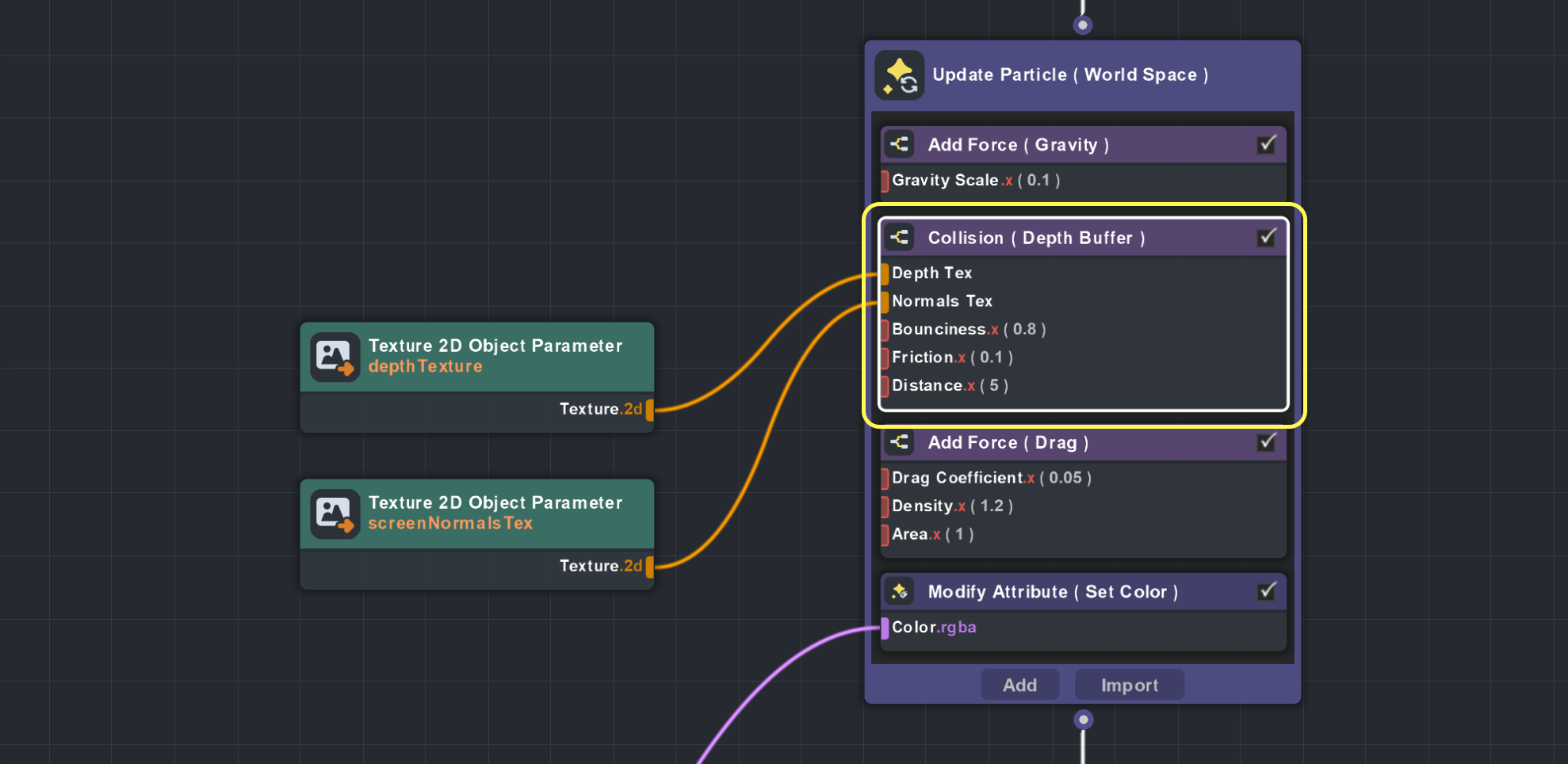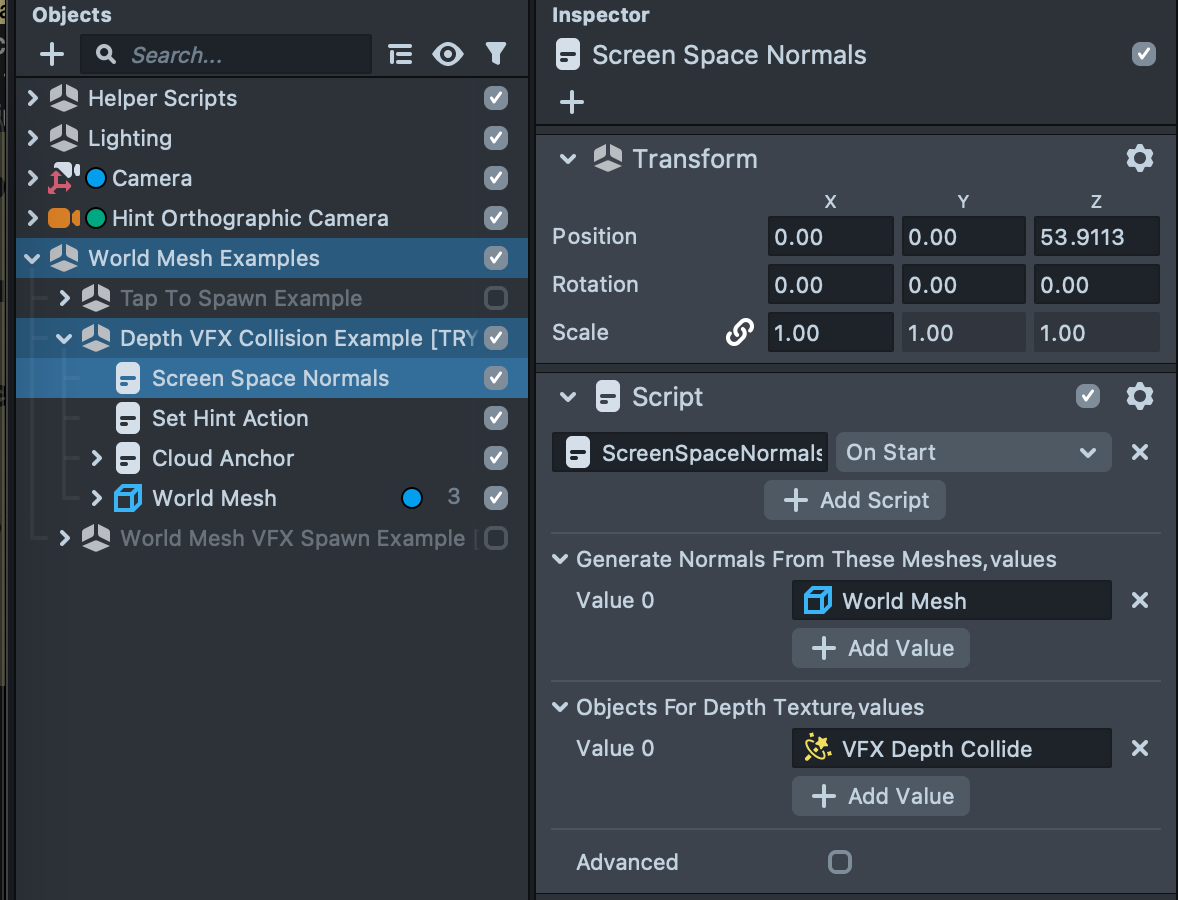 In order to have our VFX collide with the World Mesh, we need to pass its data to the VFX asset. The ScreenSpaceNormals helper script lets you convert and send data from the world mesh to a VFX asset(s).