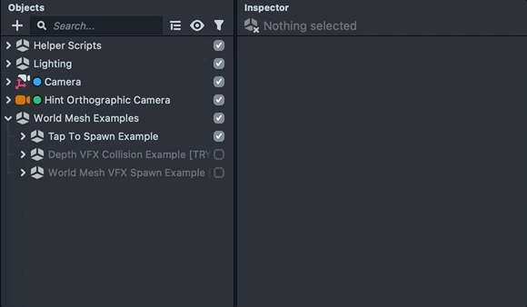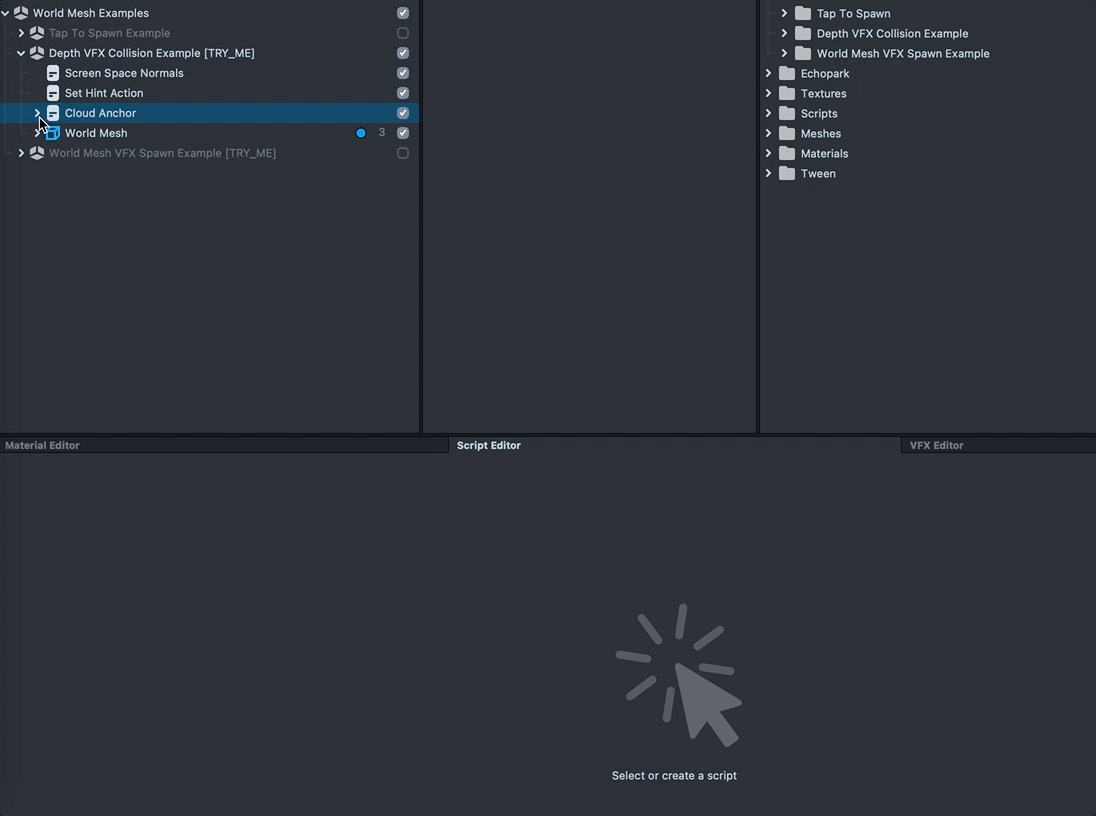 Now that we know the basics of how this example works we can easily modify the VFX by selecting the VFX Depth Collide object under the Cloud Anchor > Cloud scene object.