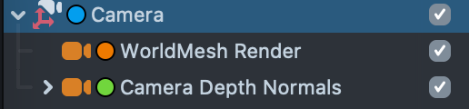 As you can see the structure of this example is very similar to the previous example. This example also uses two extra cameras. One is to render the world mesh depth stencil and another one to use the information from depth stencil to generate surface normal information from that.
