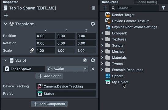 Now that we have our prefab ready, let’s modify the example so we can spawn our own prefab into the world. To do that first select the Tap To Spawn [EDIT_ME] object under the Tap to Spawn example.