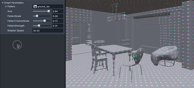 This example also comes with a custom graph material that lets you easily design patterns and attach it to the world.