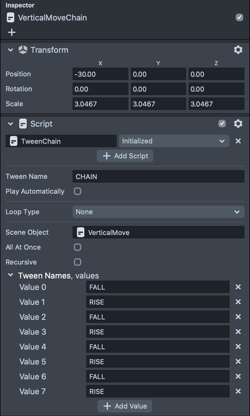 Then on TweenChain > VerticalMoveChain, we have a TweenChain script that’s calling the tween animations on the VerticalMove object in a certain order.