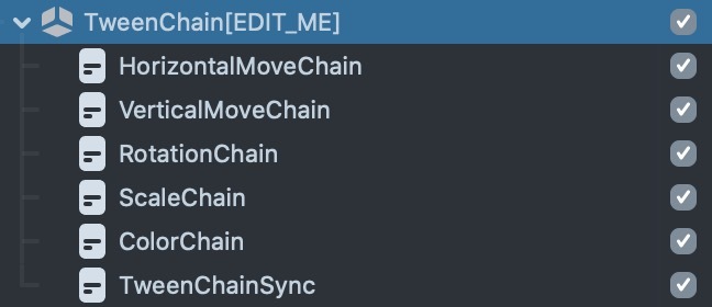 We have all our chain objects set up in a similar fashion for each of our tweens. Note that each chain contains tween animations which all add up to the same time length (this is important if the animation has to loop).