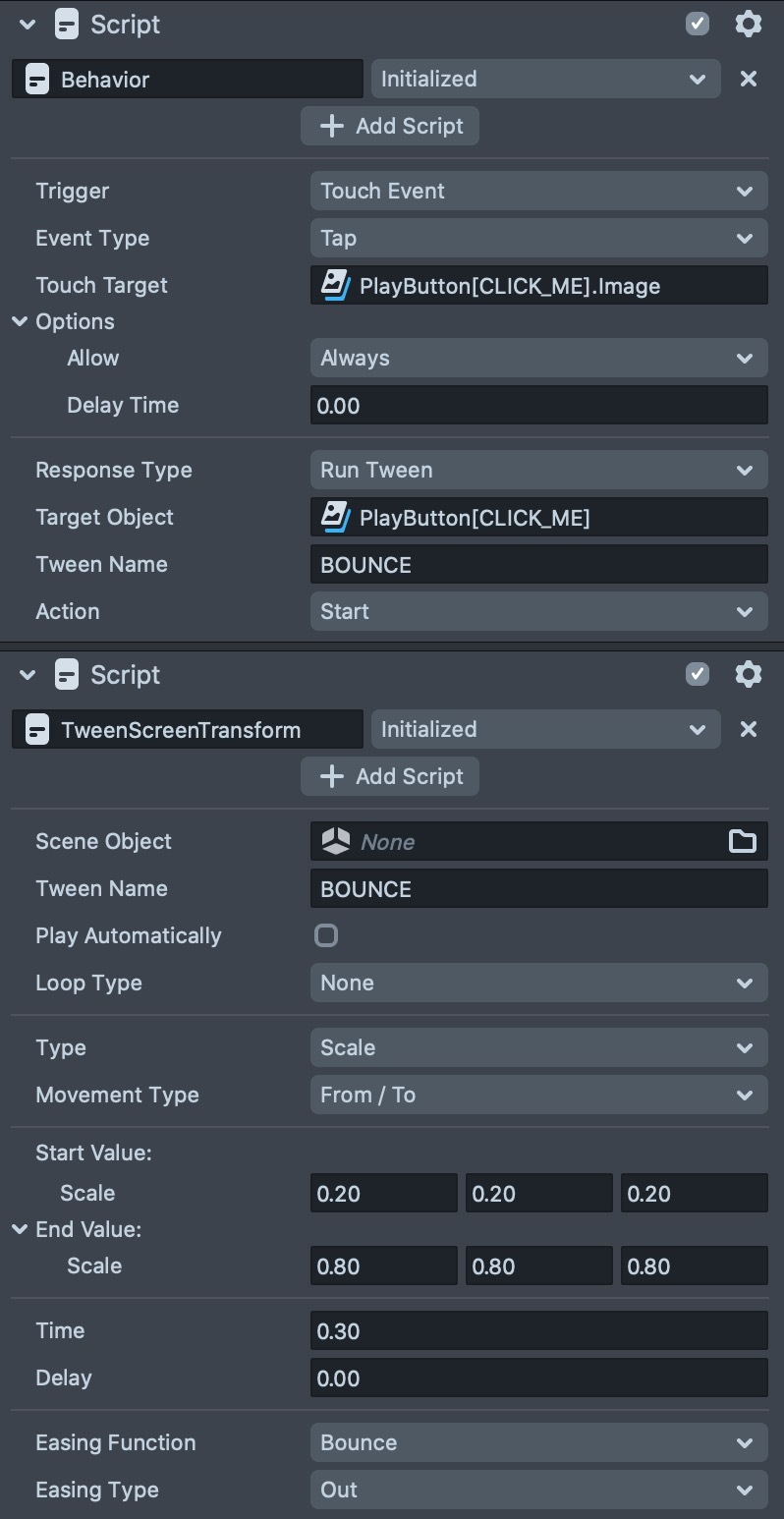 One Behavior script runs a tween called BOUNCE that’s attached on the PlayButton. So the BOUNCE animation plays every time the PlayButton is pressed.