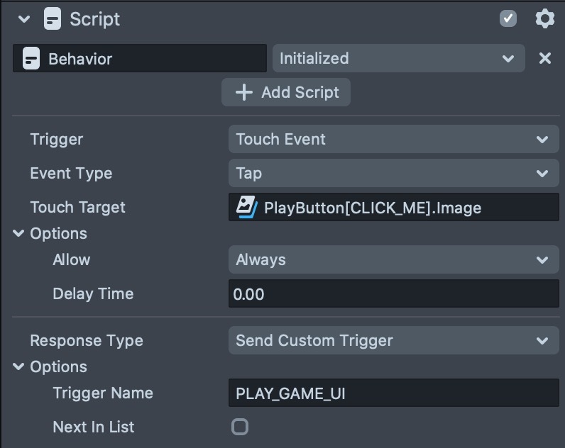 Another Behavior script sends out a global trigger PLAY_GAME_UI.