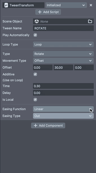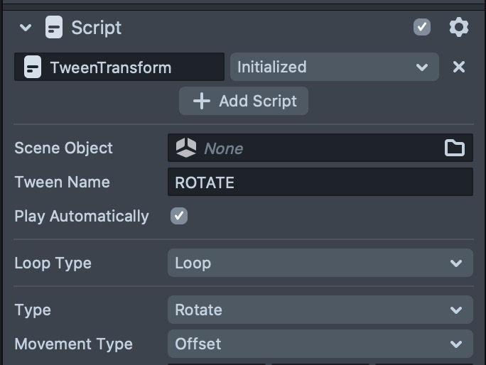 If the Scene Object input is left blank, then the tween animation would be applied to whichever object this script is attached to.