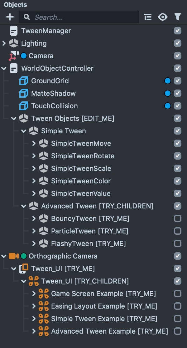 The template contains several examples of tween scripts being applied to objects to demonstrate what you can do. You can find a Simple Tween object and an Advanced Tween object under WorldObjectController > Tween Objects in the scene which houses these examples. You’ll also find the Tween_UI object under the orthographic camera with animated UI objects under it. Feel free to toggle on objects labeled with [TRY_ME] to see the extra content in the Tween Template!
