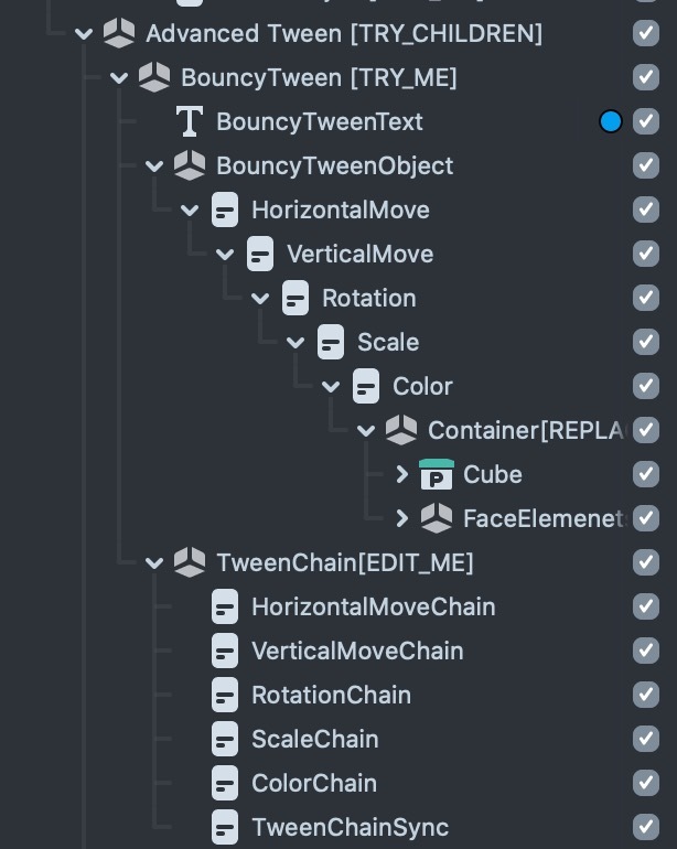 For example, the Bouncy Tween object is set up under a few layers of parent objects, each of which does one type of animation, such as move vertically, move horizontally, scale up and down, etc.