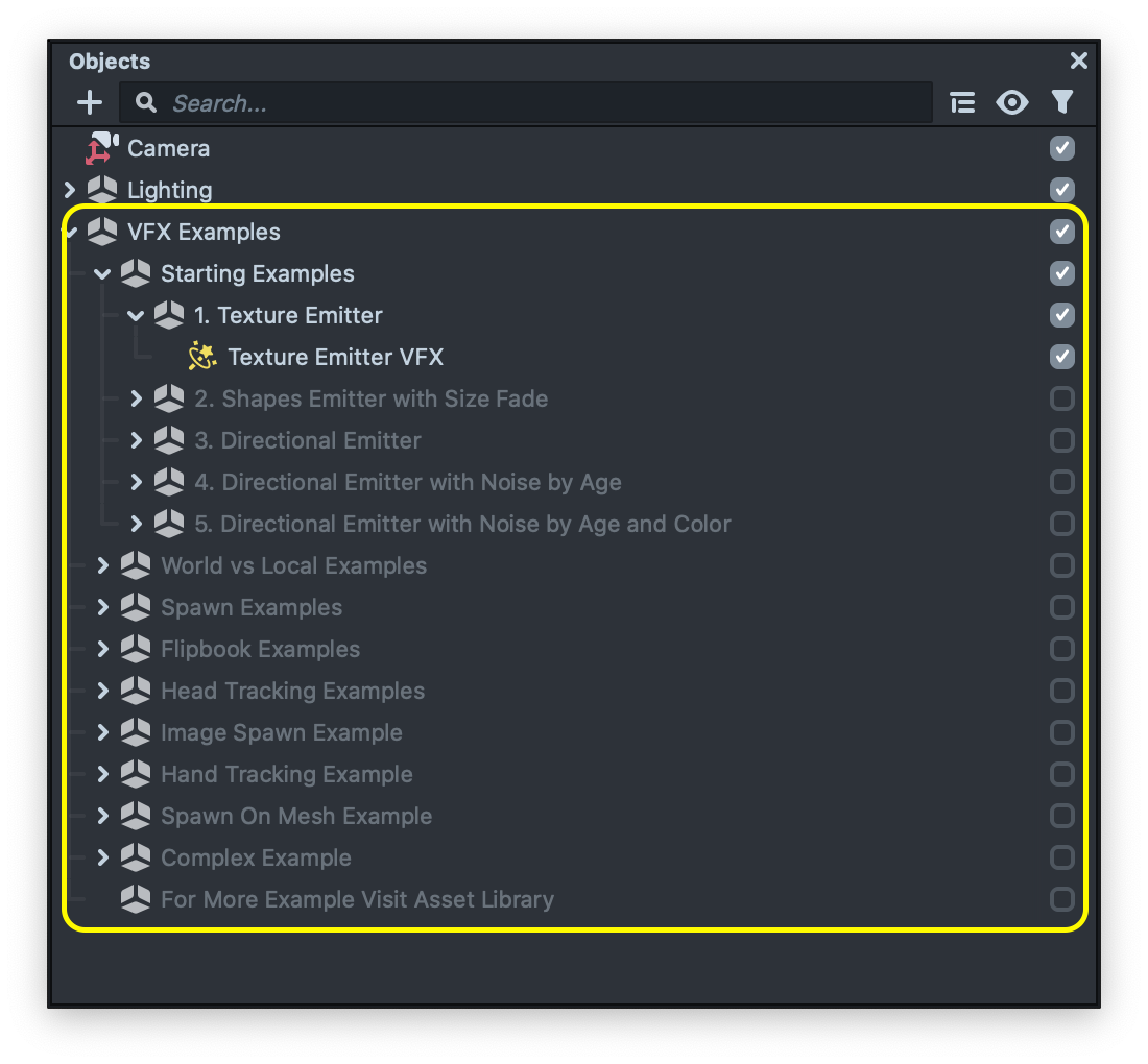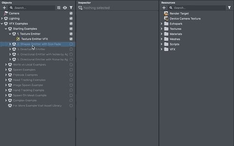 Each example contains an object which contains a VFX component with the related VFX asset. Same as the Material Editor or Visual Scripting, to see or modify the vfx in each example, take a look at the corresponding VFX asset in the Resources panel. Then, double click on it to open it up in the VFX Editor panel.