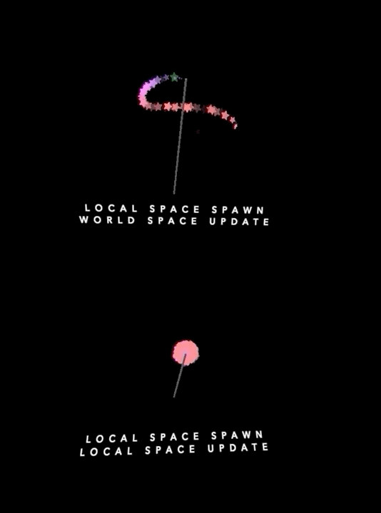 Local Space simulates the effect locally to the Scene Object that holds the VFX Component But World Space simulates the effect independently of the Scene object that holds the VFX Component.