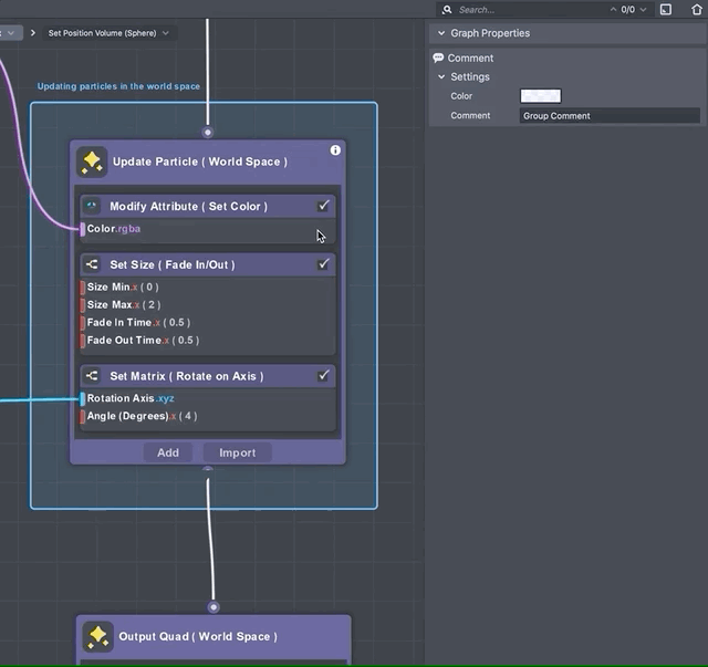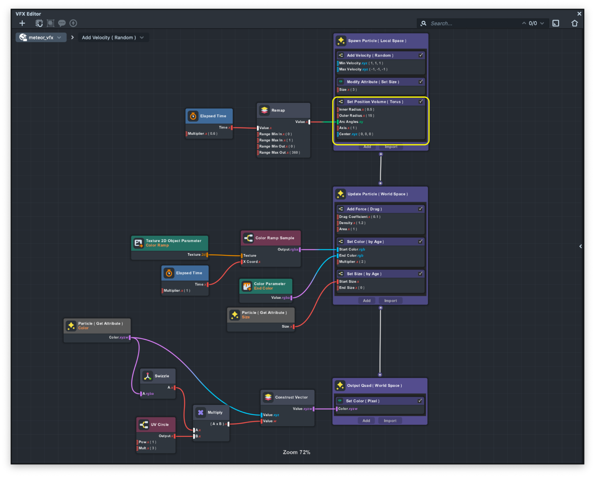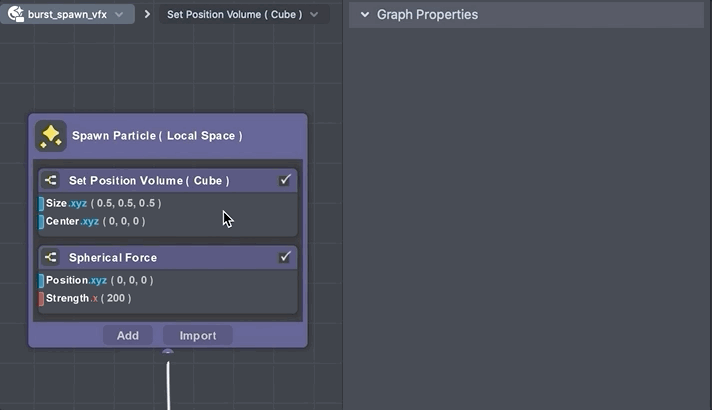 If we take a close look at the graph, we can see that there is a new sub-graph in the spawn container which is called Set Position Volume ( Torus ), As you can guess from the name, this sub-graph will spawn the particles in a torus shape.