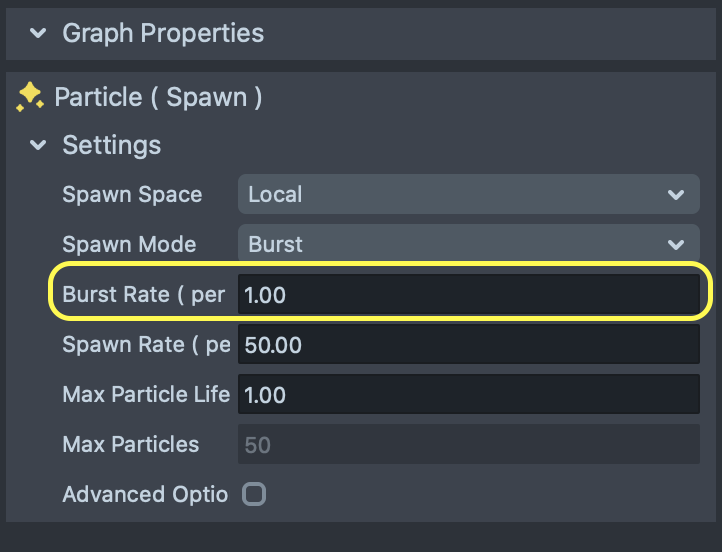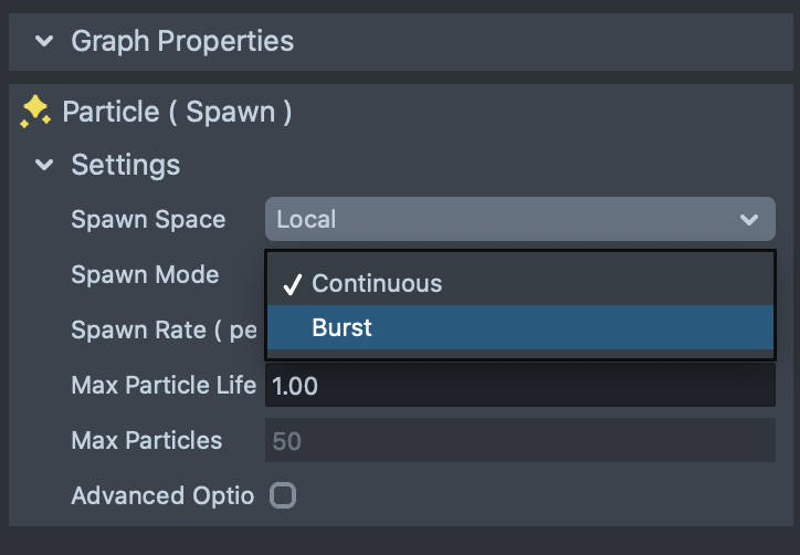 Continuous spawn mode will spawn particles continuously but Burst mode will spawn particles every couple of seconds that can be modified in the Spawn container.