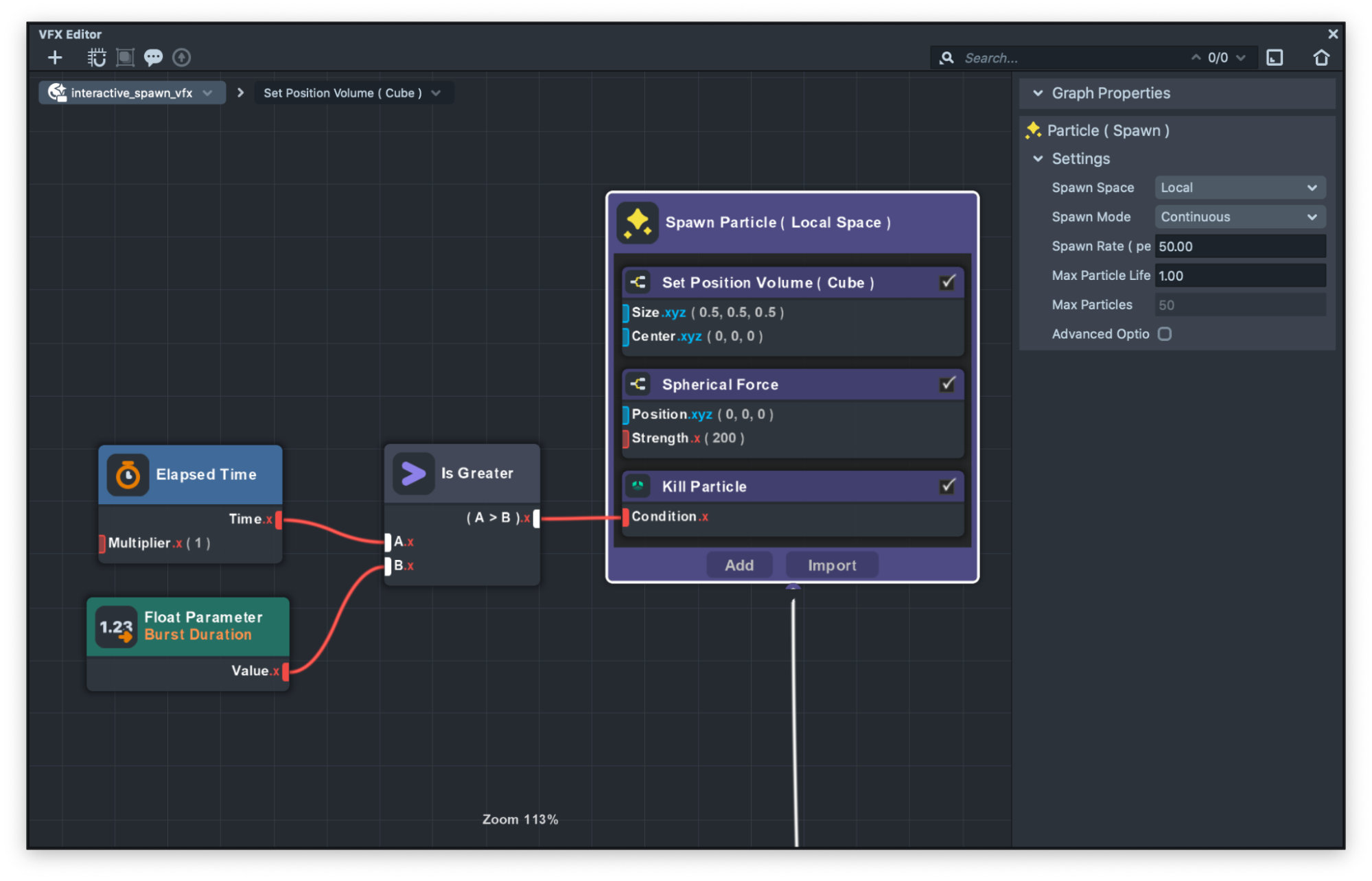 This example shows the different types of spawning available in the VFX Editor. There are two presets available to choose from when spawning particles.
