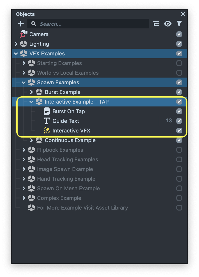 In the Objects panel, expand the Interactive Example - TAP object to see its children.