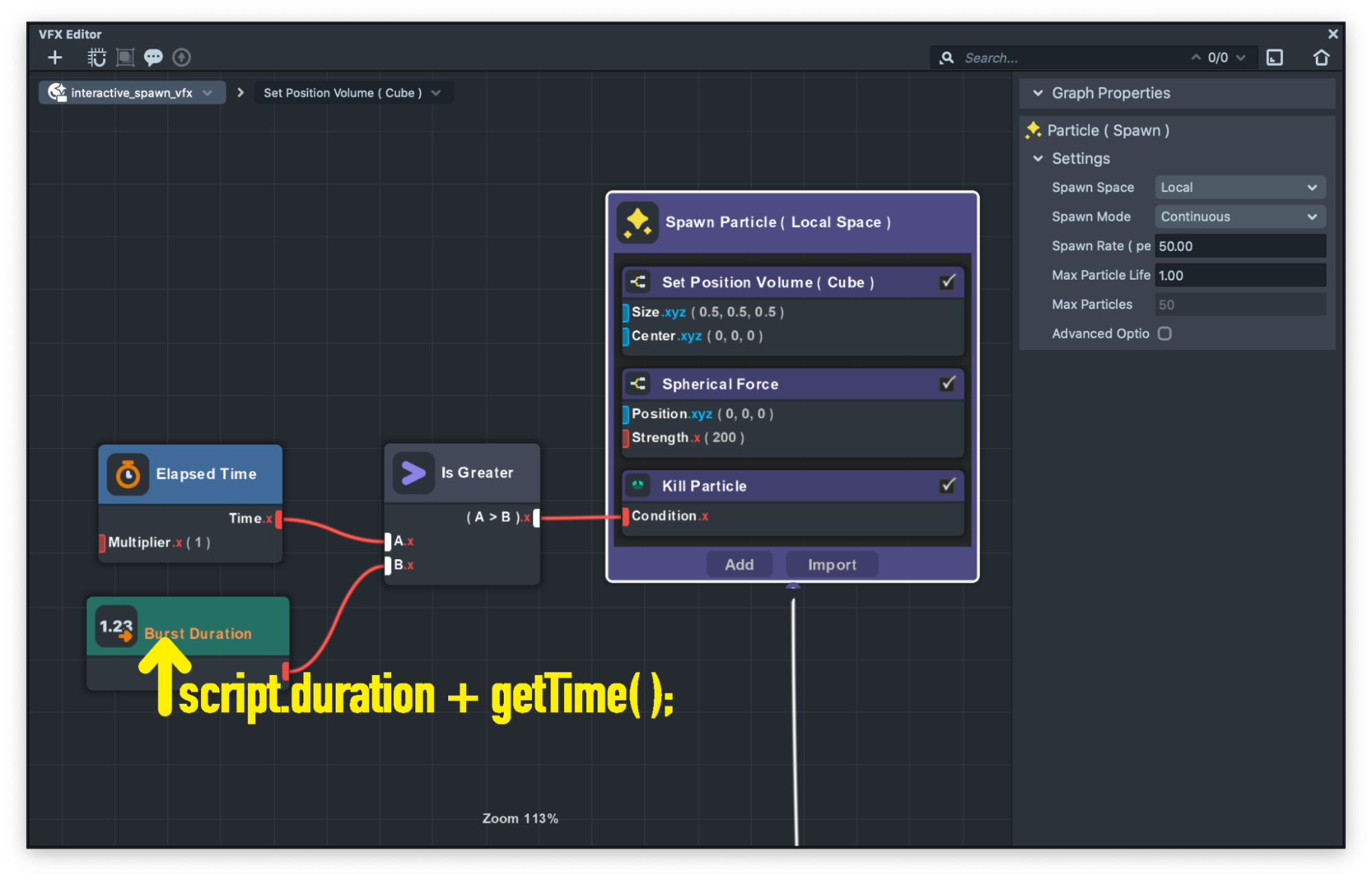 You can see we are passing the current time with addition of our spawn duration to the burstDuration input in the VFX graph.
