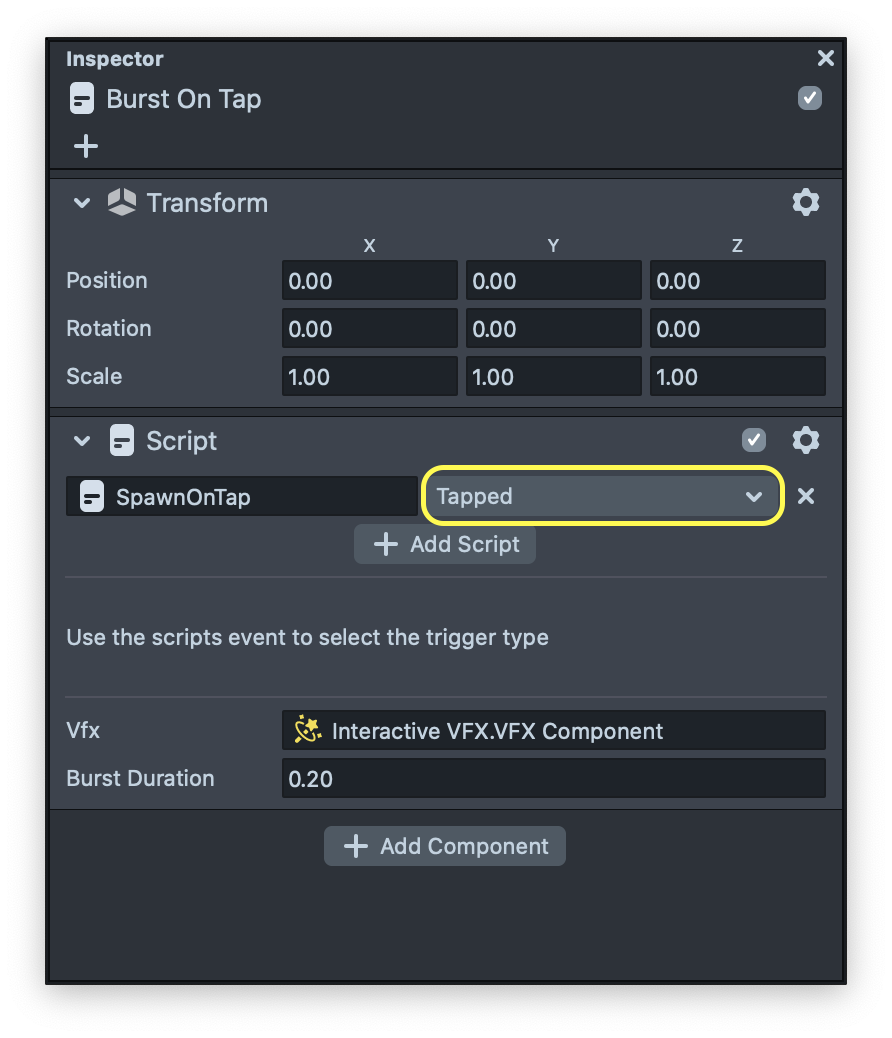 For this example it is set to trigger on tap but feel free to change it and make the spawn happening on other events.