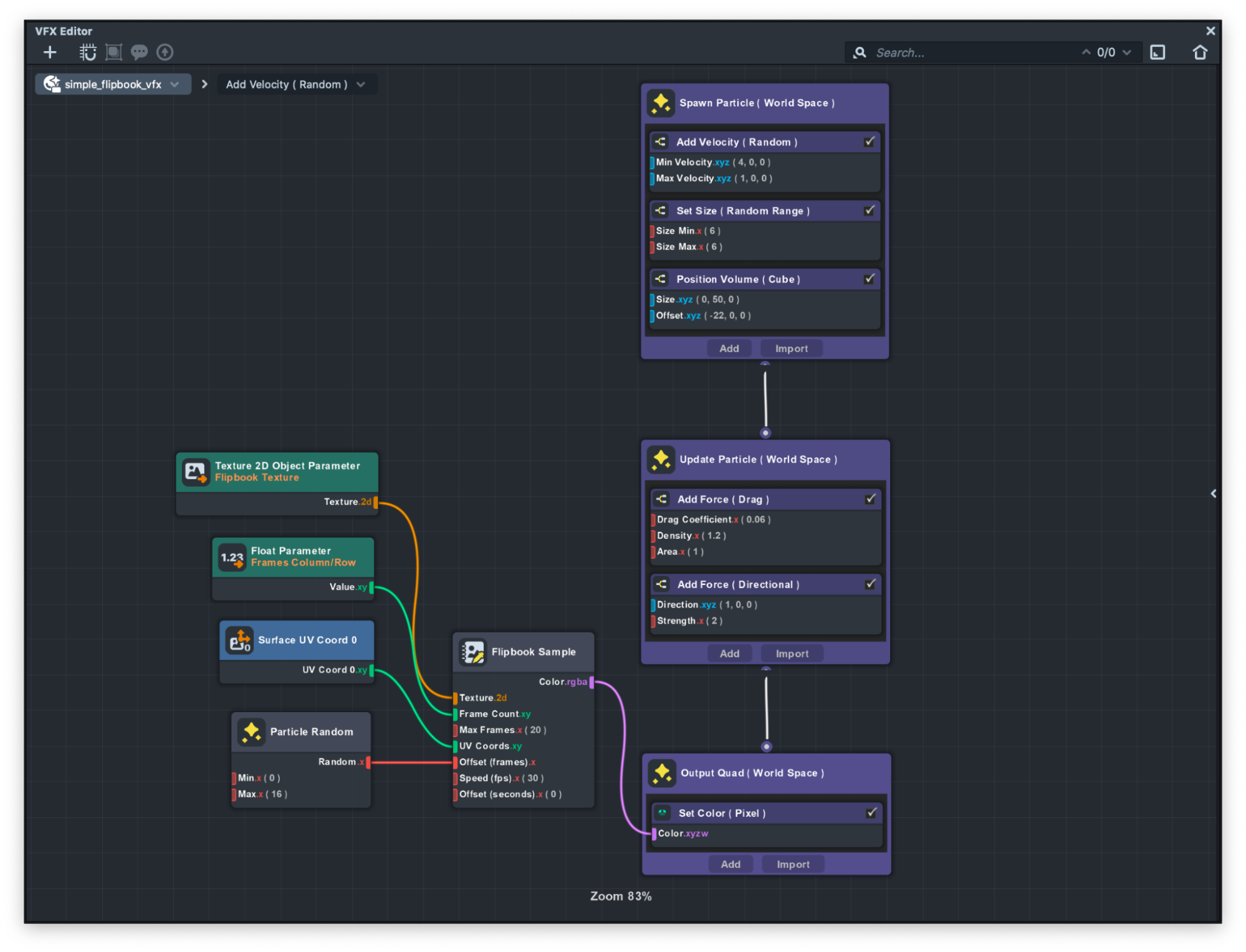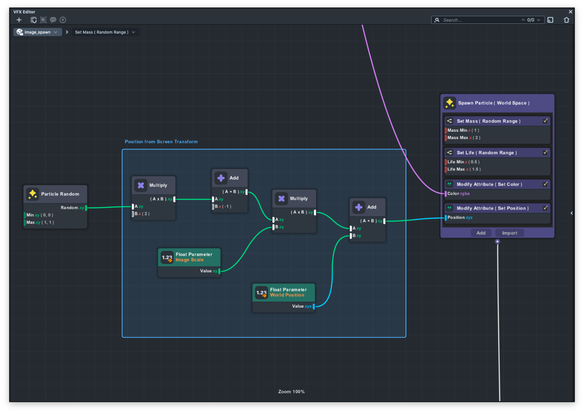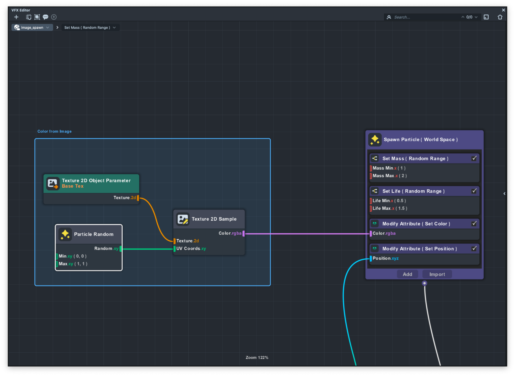Ok, so how do we sample the textures from VFX Editor? Individual particles don’t have a standard UV coordinate, so instead we can just use a two-channel Particle Random node to give us a unique number that we can use as a texture coordinate. When only used in the Spawn container, setting Particle Random’s seed to Unique will ensure good coverage over time when reading textures (see Particle Random documentation for more information).