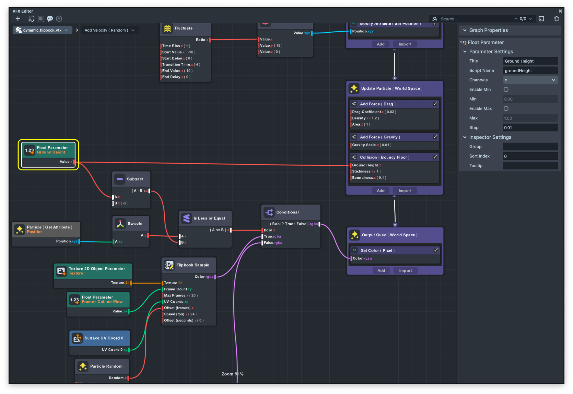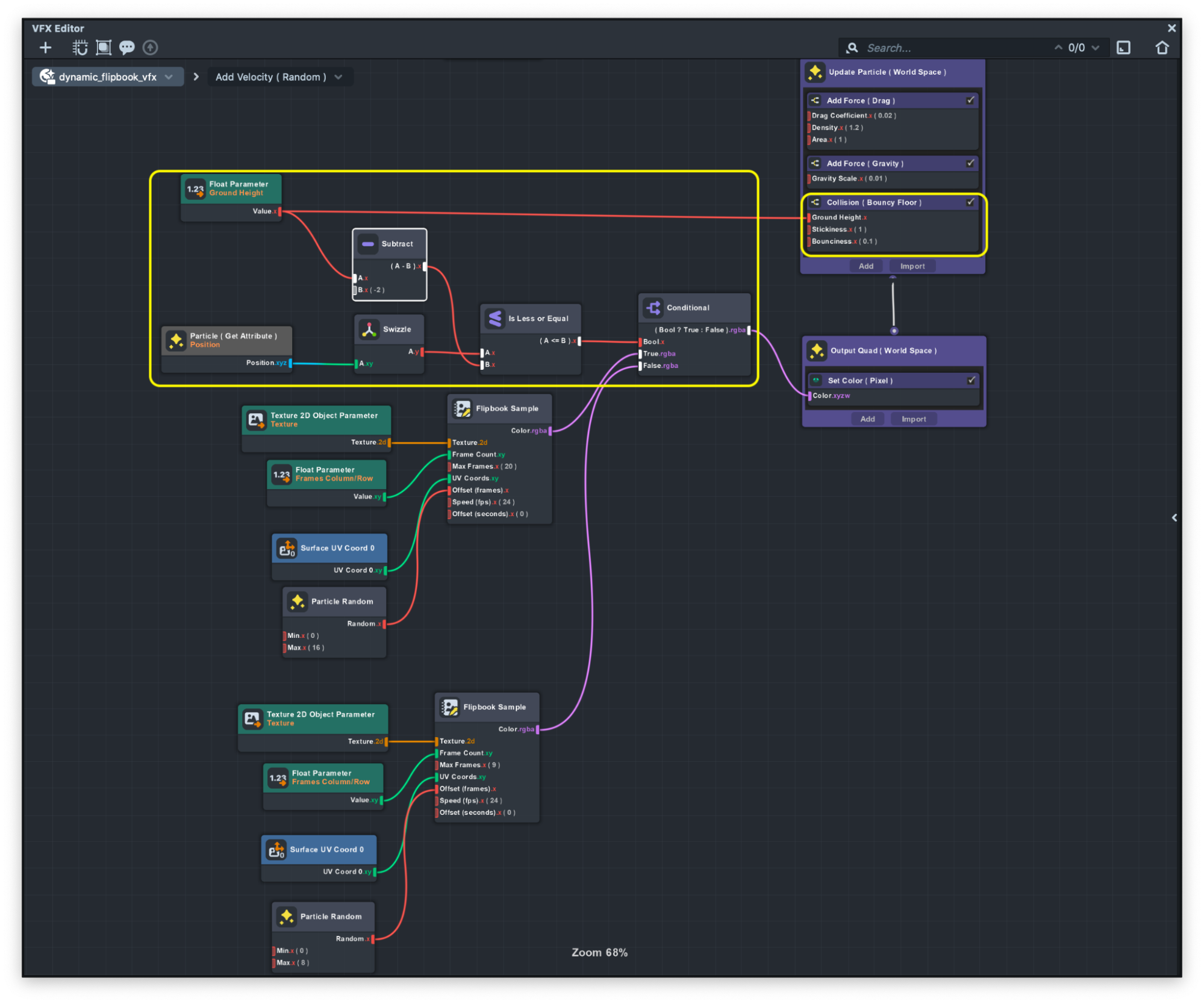 If we take a closer look at the dynamic_flipbook_vfx graph. We can see that we are specifying the ground height using the Ground Height parameter. This value can be customized in the Inspector panel to set where the position that if any particles reach that point the texture will change. You can see the logic in the image below
