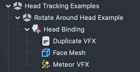 Rotate around the head example takes advantage of simulation space as well as head binding to attach VFX to a head. Also we use JavaScript code to duplicate one vfx and place it around the head. We will start by explaining the VFX and then we will talk about how to duplicate the VFX using JavaScript.