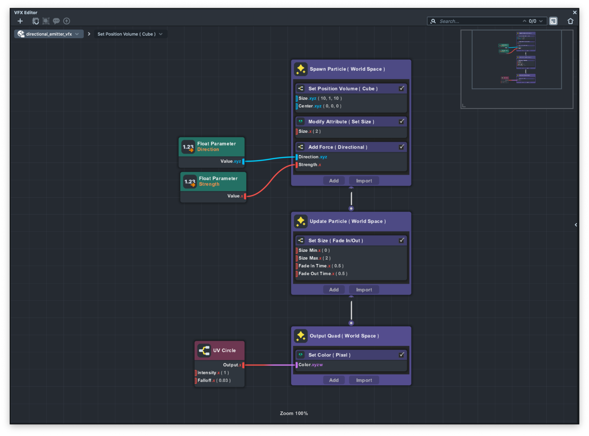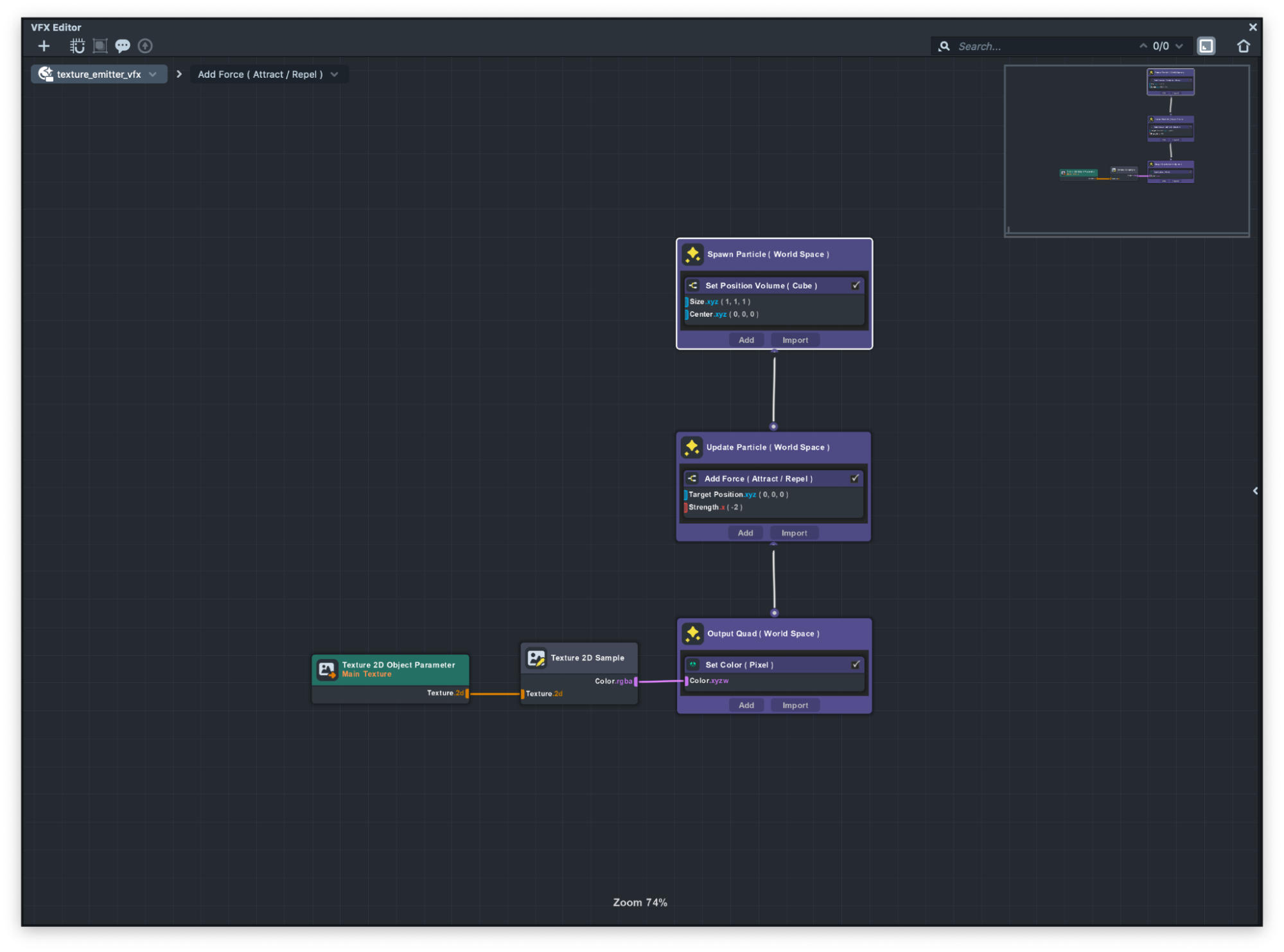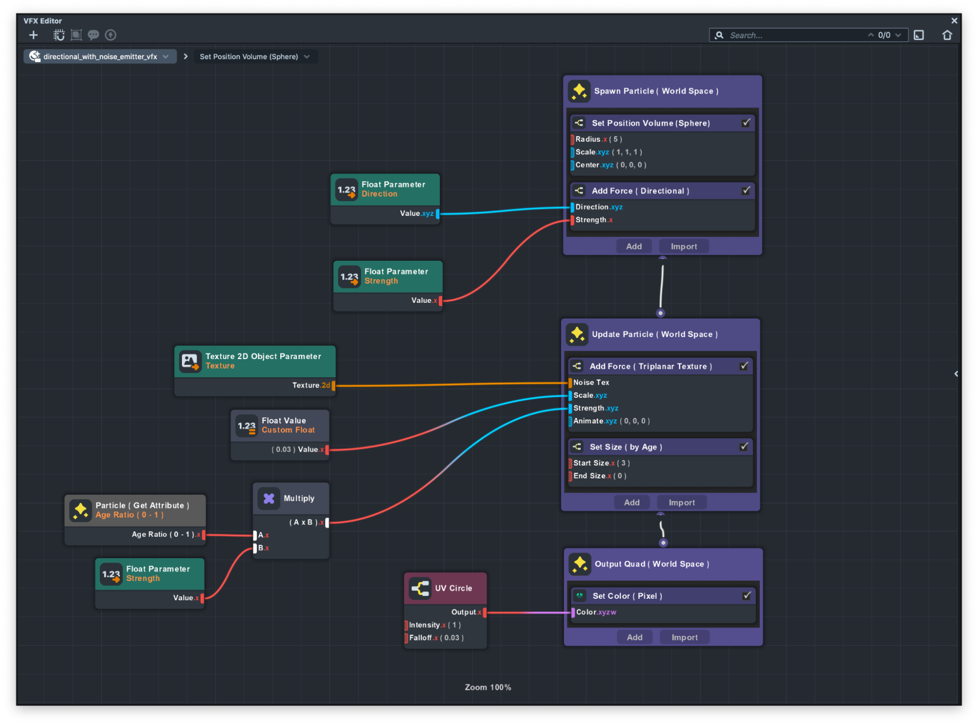You are free to add any data you want to these channels that could make your particle simulation more interesting. For example, you could add a mask in one of the channels to control where particles spawn, or how big or fast they should be. Since VFX Editor and Material Editor are completely open to editing, you can tweak these assets to suit your specific effect.