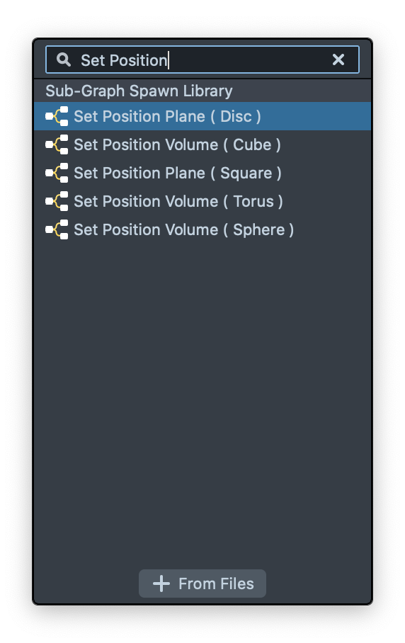 Same as the Set Position Volume ( Torus ), there’s a similar subgraph that helps you to spawn the particles in different shapes. We recommend checking the other subgraph as well!