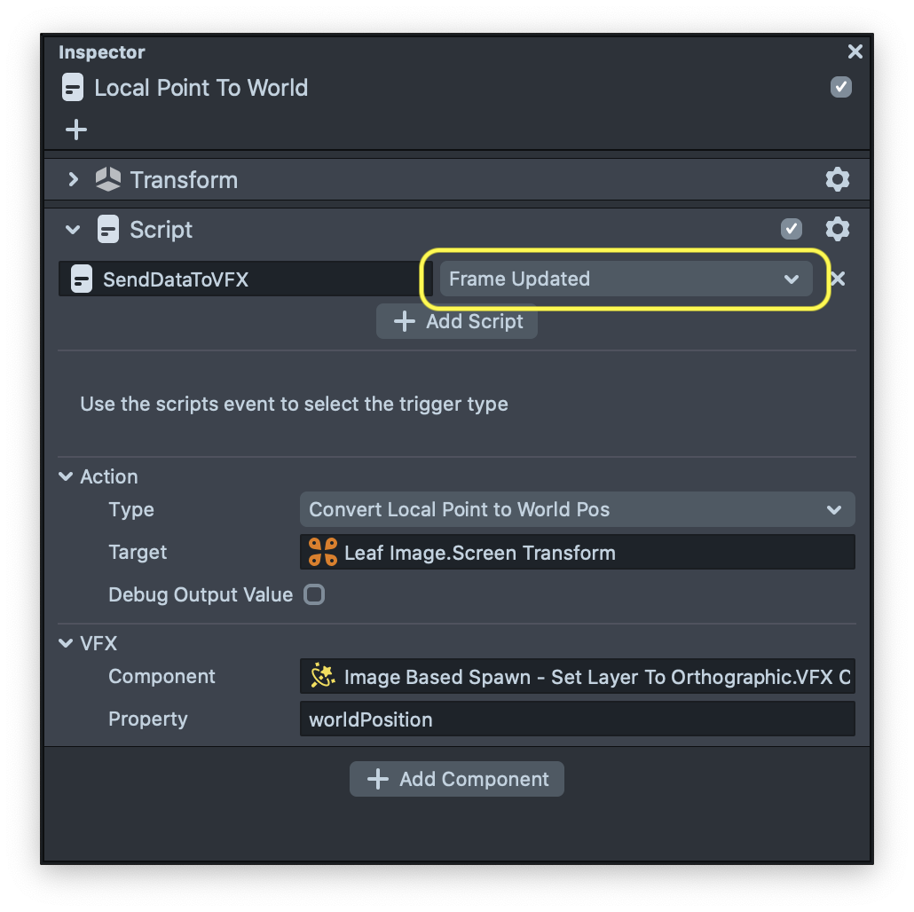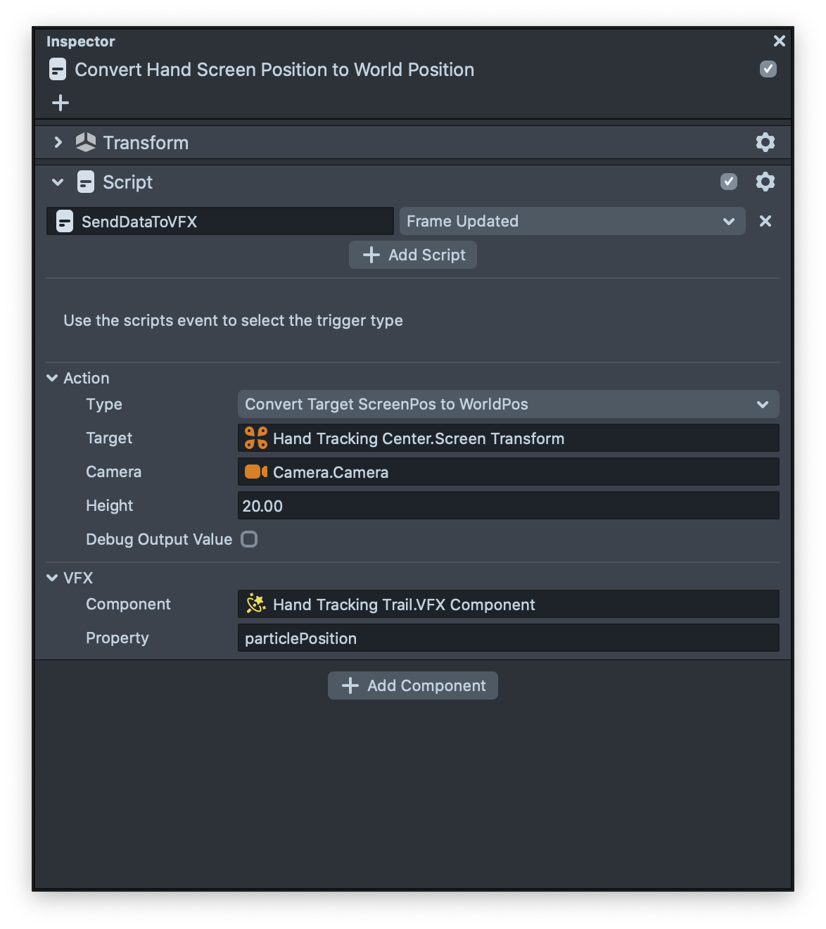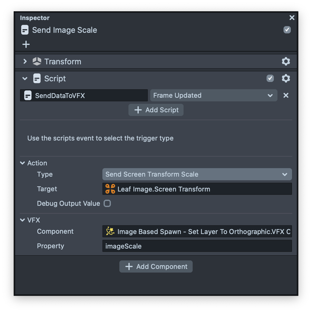 And then in the second SendDataToVFX script we send the screen transform scale to the imageScale property of the VFX.