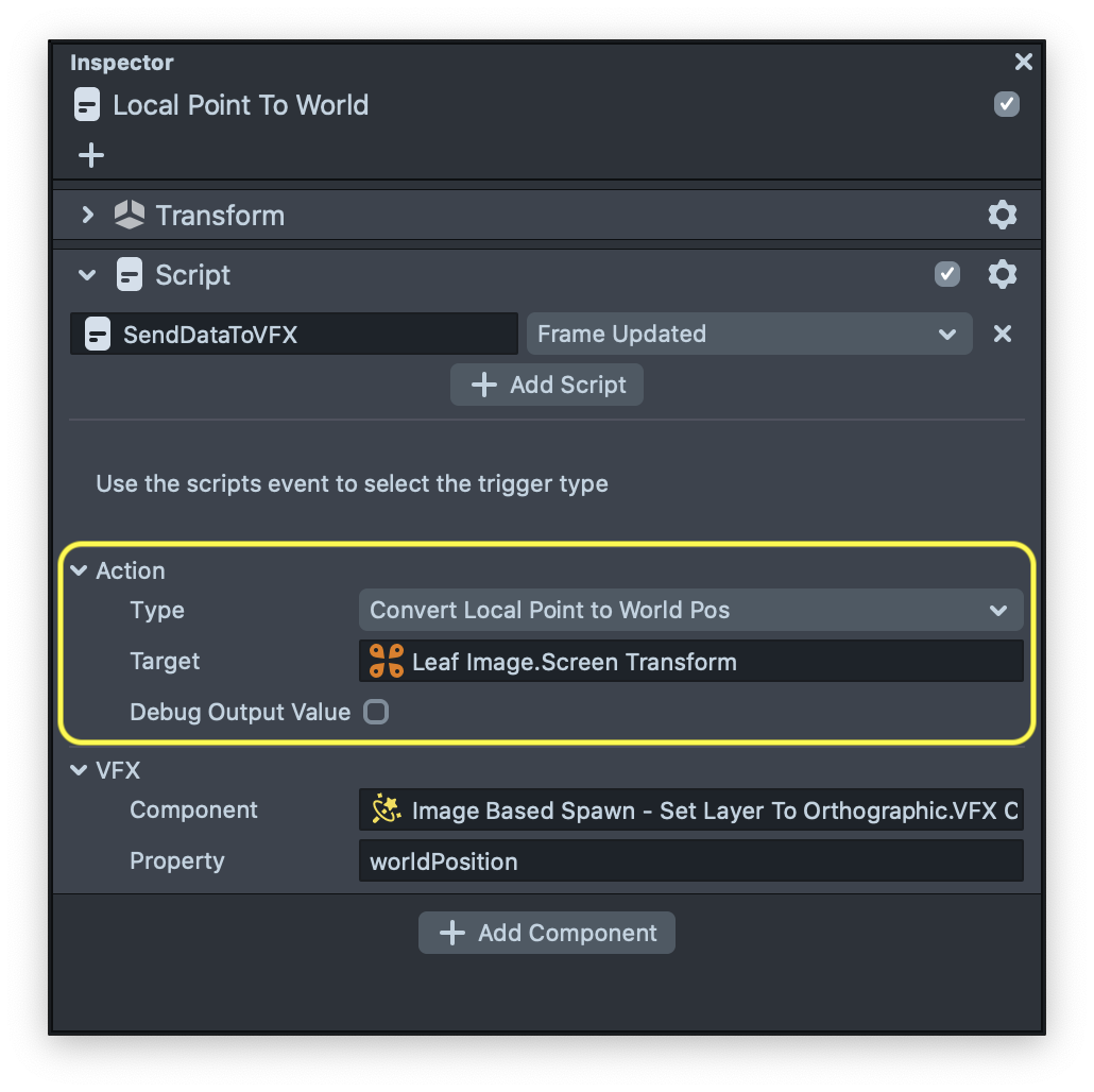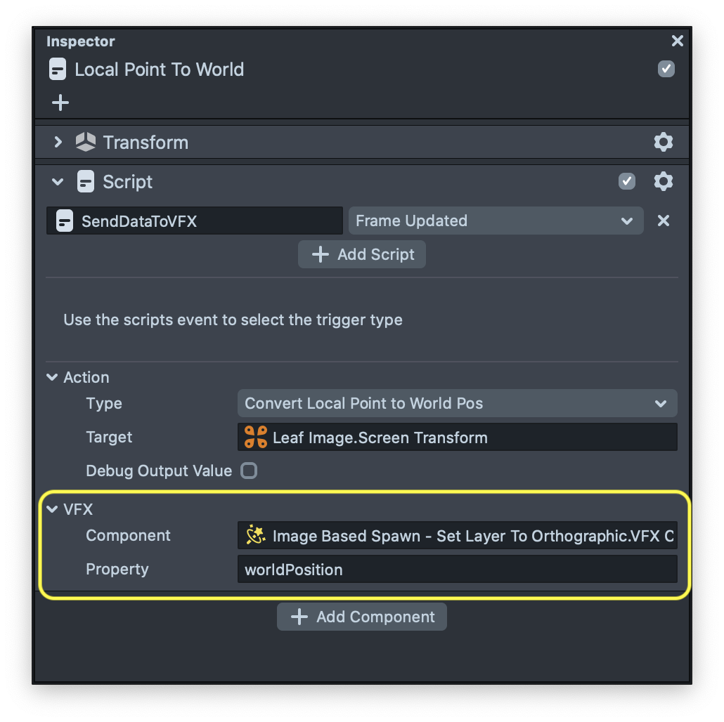 Based on what we explain above in this script we’re getting the screen transform of the image and sending the vec3 world position of the image into the worldPosition of the VFX’s component.