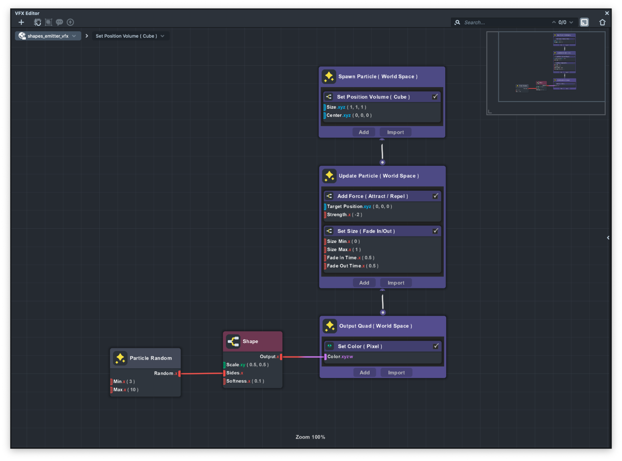 This VFX is almost identical to the Texture Emitter example but as you can see instead of rendering texture, we use the Shape sub-graph to create different shapes and apply it to each particle.