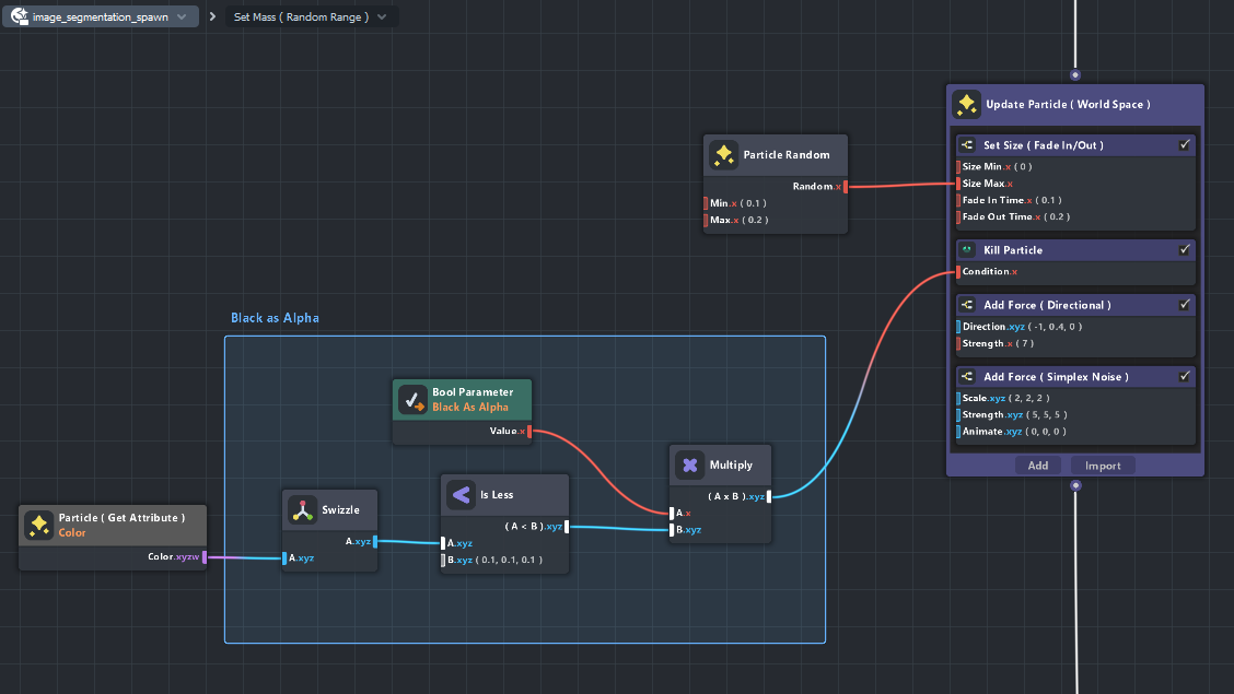 You can see in the graph we are getting the particle color using the Get Attribute node and just compare the RGB to see if it's a black color or not. If it was black we just kill the particle using the Kill Particle node. With this technique you can easily spawn particles on a Segmentation texture.