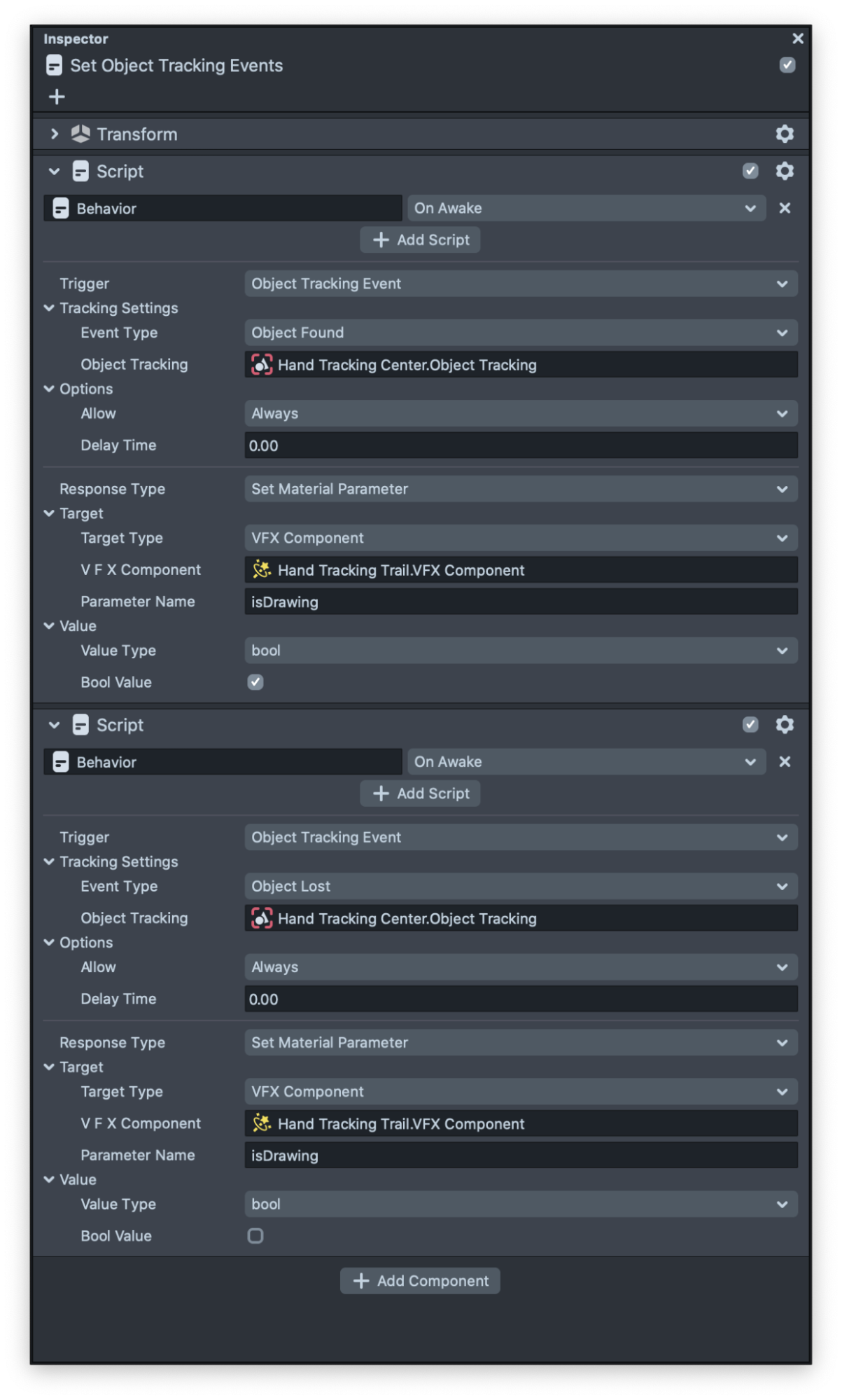 Since we want to spawn the particles only when the hand tracking is happening, we use a behavior script to tell the VFX if the hand tracking is detected or its not detected.