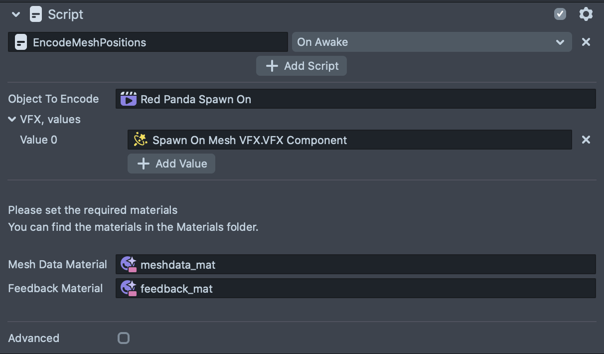 This example provided a helper script called EncodeMeshPositions which is responsible for reading the mesh data and passing it as a texture to the VFX.