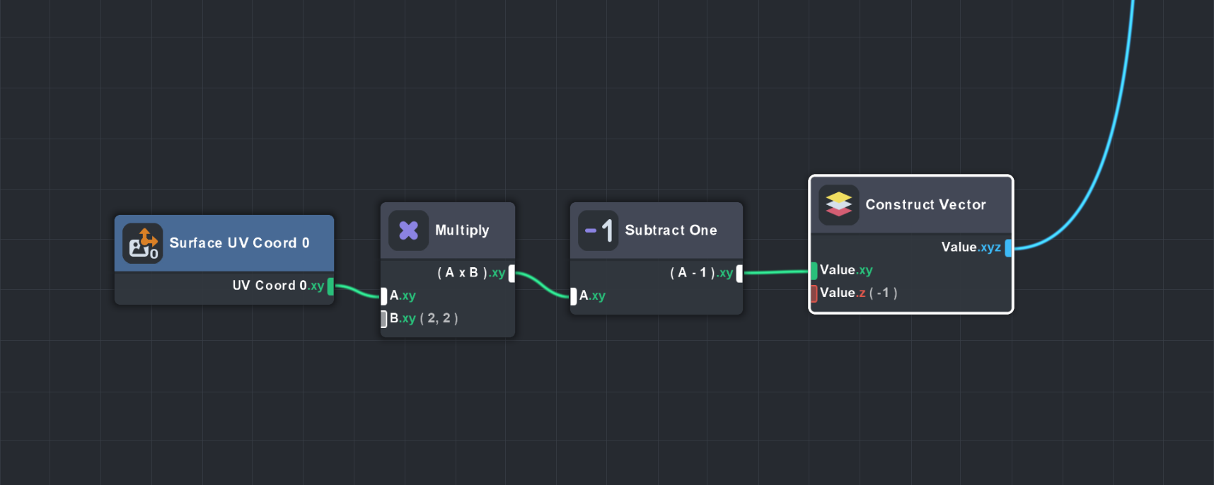 The first thing to look at in this material is its vertex shader. Since we are assigning this material to geometry we want to encode, we need to transform the geometry’s vertices to be in a 2D space that captures as much of its surface as possible. The easiest way of doing that is to just use it’s UV positions as the vertex position, which is what you see here: