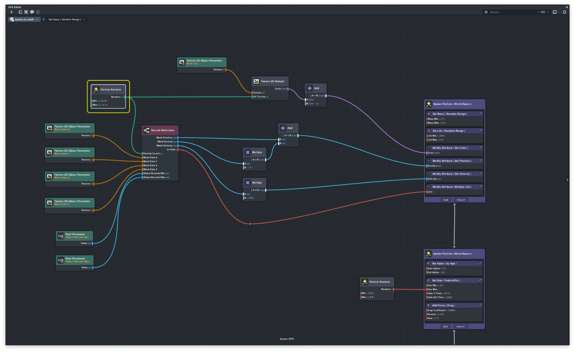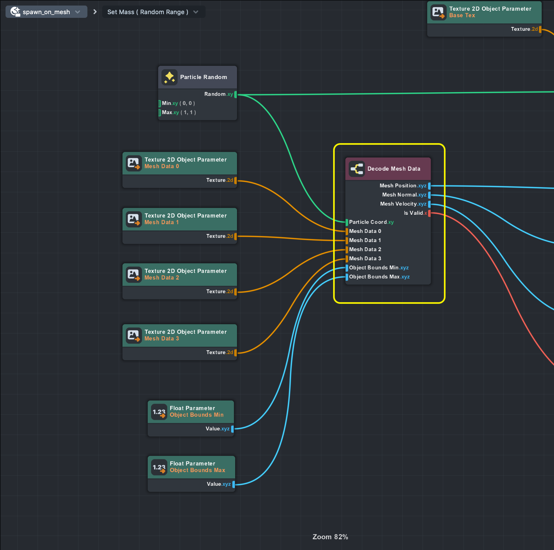 VFX Editor stores particle data into texture buffers, so the most straightforward way of getting particles to spawn on mesh positions is to store the mesh positions into textures as well. Once mesh data in textures, it’s easy to get particles to sample the textures and use the data for all sorts of interesting effects.
