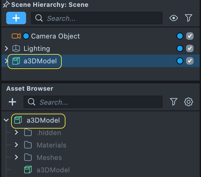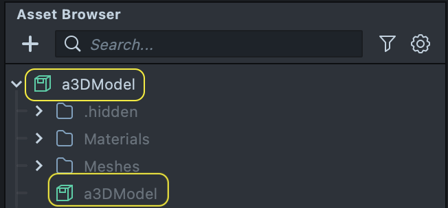 Your model's resources (meshes, textures, materials, and animations) will now be available in the Asset Browser panel.