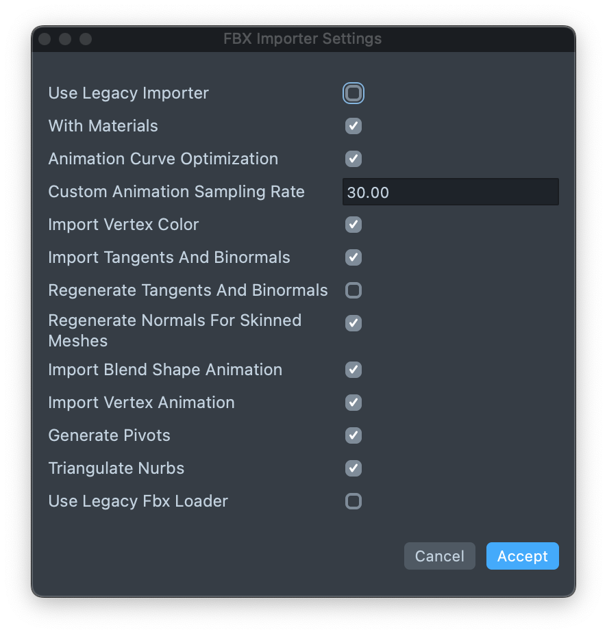 - Custom animation sampling interval: The frame rate of the imported animation (defaults to 30 frames per second).