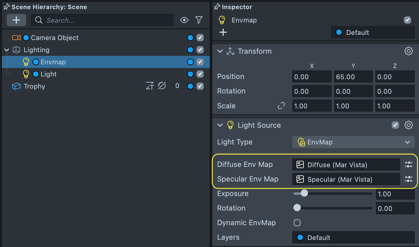 After import, two textures will be generated: a diffuse and a specular environment map. Select the Envmap light source and replace the textures with your newly generated diffuse and specular textures.