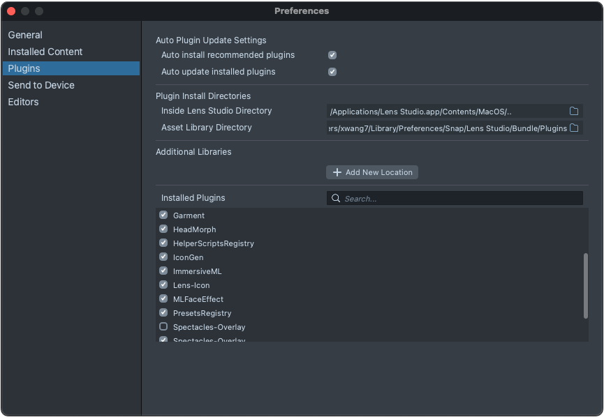 Plugins enable Lens Developers to extend the functionality of Lens Studio. You can manage the plugins in the Lens Studio Preferences. Learn more about Plugins.