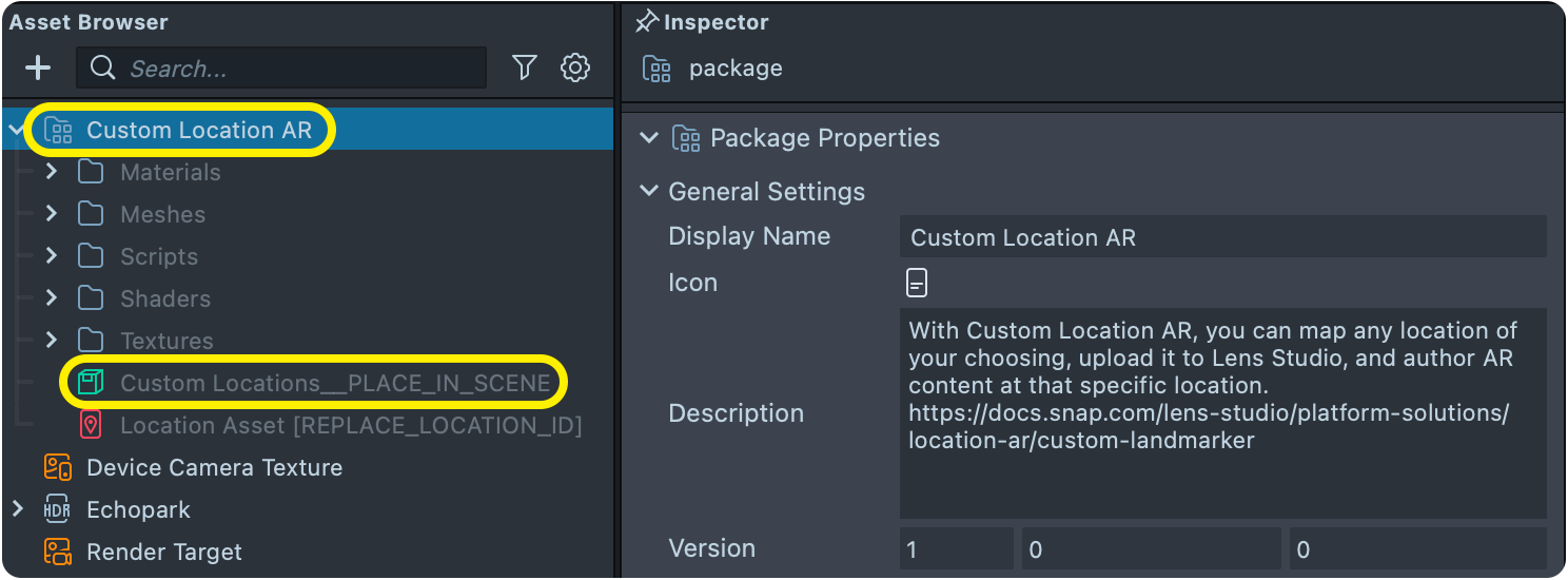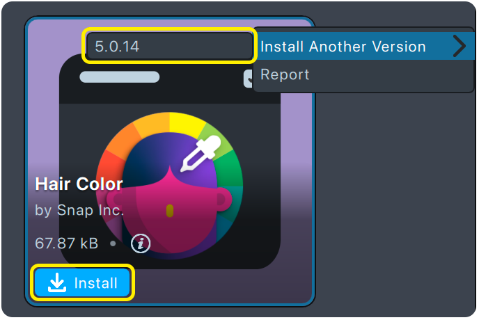Some assets get installed to your Lens Studio instead of being added to the current project. For example items from the Custom Components section or other assets that support versioning. Click on the Install or Update button on the asset tile, or click on the context menu button in the top right corner to install a different version. Learn more about Custom Components and Asset Packages.