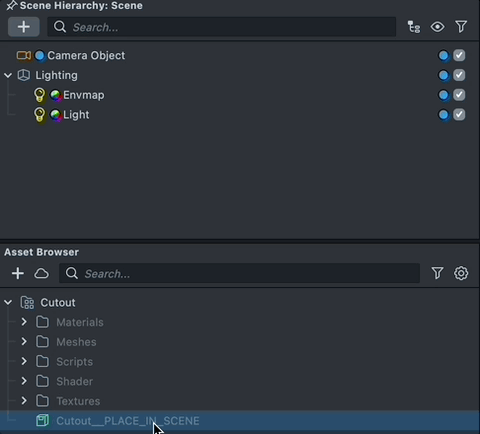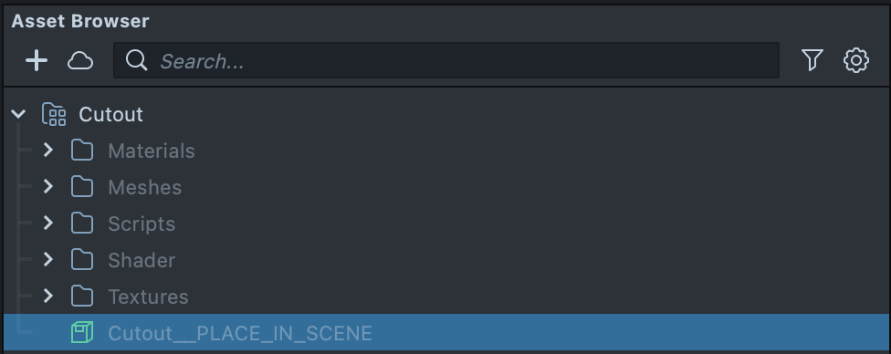 Drag the prefab Cutout__PLACE_IN_SCENE inside the Cutout folder, into the Scene Hierarchy panel to create a new instance.