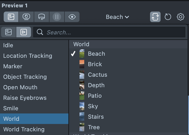 Switch the preview video to one of our World Lens preview videos. In the preview panel, press the Image / Video Mode button. Then, in the drop down at the top of the Preview panel, select any video under the World category.