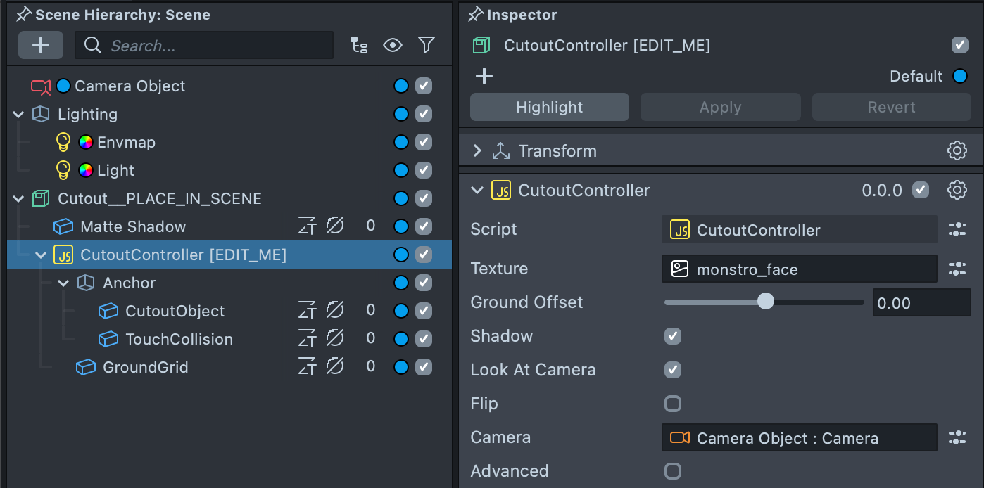 Next, in the Scene Hierarchy panel, select the CutoutController [EDIT_ME] object.
