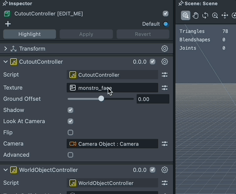 With the CutoutController [EDIT_ME] object selected, you can configure its settings in the Inspector panel. First, click the Texture field and set it to your newly imported Texture resource.