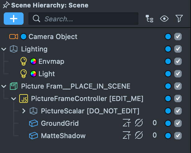 Picture (Asset.Texture)- The texture that the frame will automatically be built around. This should be replaced by your imported texturePicture Scale (float)- The scale of the picture and picture frame. The larger the scale, the bigger the picture in the scenePicture Ground Offset (float)- How far off the picture frame is from the groundFrame Color (vec4)- The color of the frame selected via a color pickerFrame Style (Dropdown)- The style of the frame selected via a dropdownMaterial (Dropdown)- The material of the frame selected via a dropdown. This allows you to select between a Glossy and Matte materialFrame Scale (float)- The scale of the frame itself. This allows you to create a thin or thick surrounding frameShadow Density (float)- The intensity of the shadow from 0.0 to 1.0. The closer to 1.0, the darker the shadow