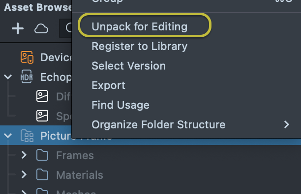 You can right-click and select Unpack for Editing from the drop-down menu to unpack all assets stored in the bundle. Click here to learn more about Asset Packages. Once you unpack the package, you can then edit its content.