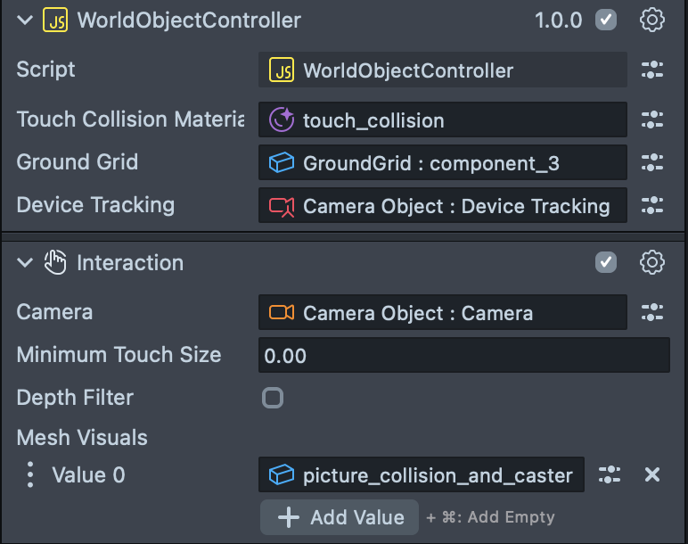 Next, ensure you assign the Device Tracking to the Device Tracking field in the WorldObjectController on the PictureFrameController [EDIT_ME] scene object, and the Camera to the Camera field in the Interaction component on the same scene object.