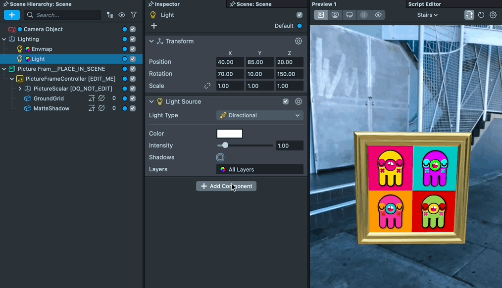 For realism, we can have the frame cast a shadow on the environment. To add a shadow, check the Shadows checkbox in the Directional Light in your project. For the best results, adjust the directional light's rotation to point in the direction where you want the shadows to be cast.